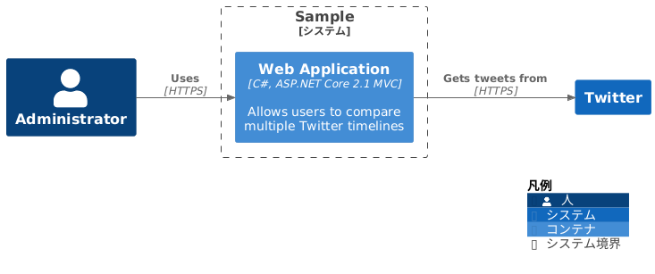 @startuml !theme C4Language_japanese from https://raw.githubusercontent.com/plantuml-stdlib/C4-PlantUML/master/themes !include https://raw.githubusercontent.com/plantuml-stdlib/C4-PlantUML/master/C4_Container.puml LAYOUT_LANDSCAPE() Person(admin, "Administrator") System_Boundary(c1, 'Sample') { Container(web_app, "Web Application", "C#, ASP.NET Core 2.1 MVC", "Allows users to compare multiple Twitter timelines") } System(twitter, "Twitter") Rel(admin, web_app, "Uses", "HTTPS") Rel(web_app, twitter, "Gets tweets from", "HTTPS") SHOW_LEGEND() @enduml