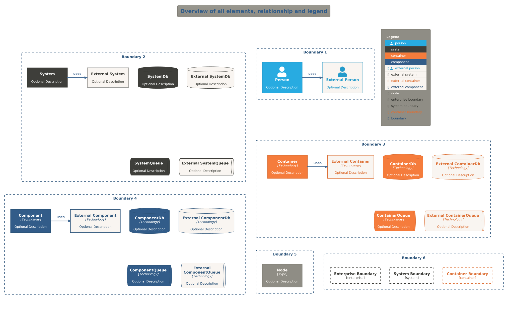 @startuml !theme C4_sandstone from https://raw.githubusercontent.com/plantuml-stdlib/C4-PlantUML/v2.13.0/themes !include https://raw.githubusercontent.com/plantuml-stdlib/C4-PlantUML/v2.13.0/percy/TestAllElementsWithLegend.puml @enduml