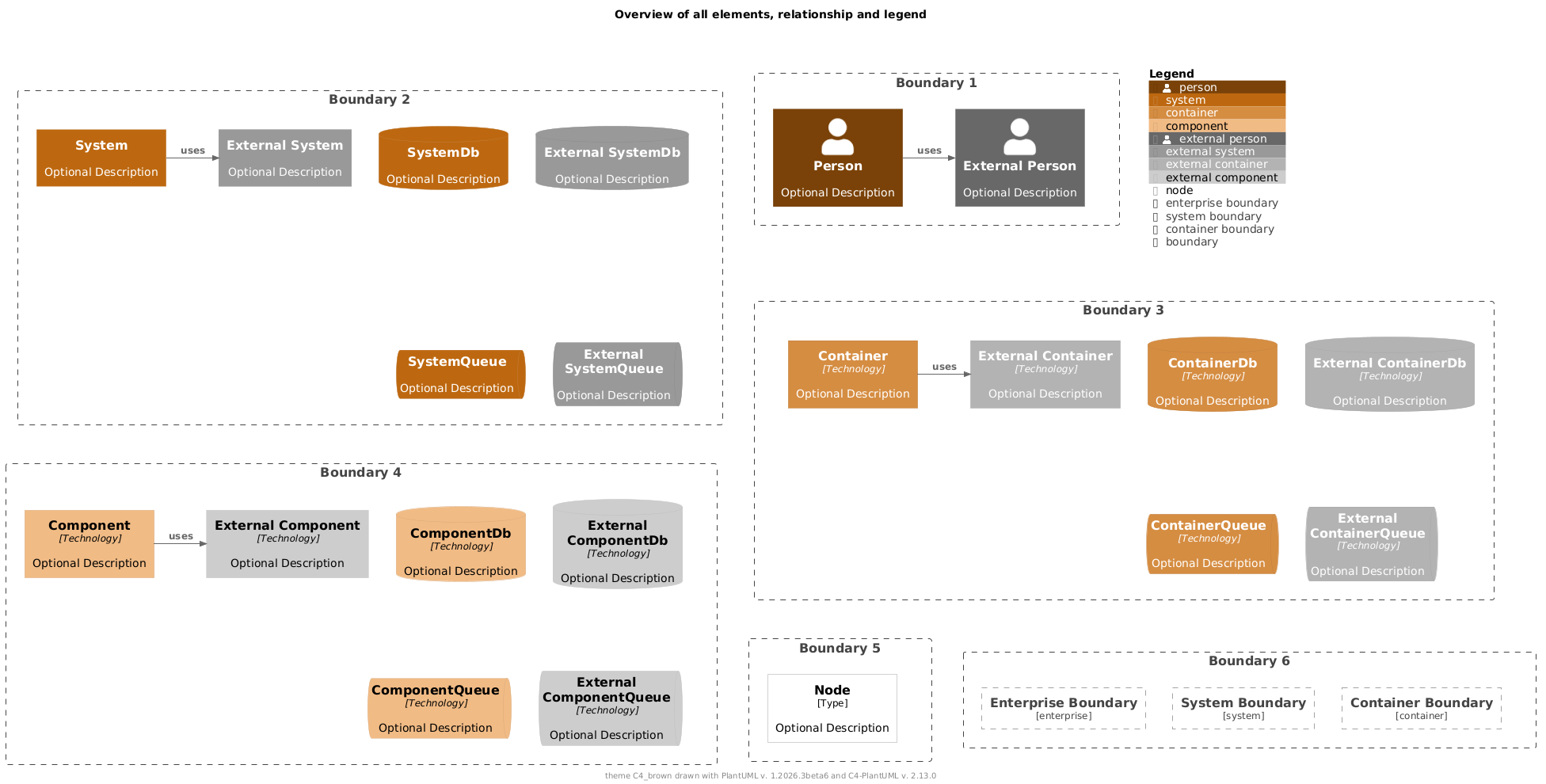 @startuml !theme C4_brown from https://raw.githubusercontent.com/plantuml-stdlib/C4-PlantUML/v2.13.0/themes !include https://raw.githubusercontent.com/plantuml-stdlib/C4-PlantUML/v2.13.0/percy/TestAllElementsWithLegend.puml @enduml