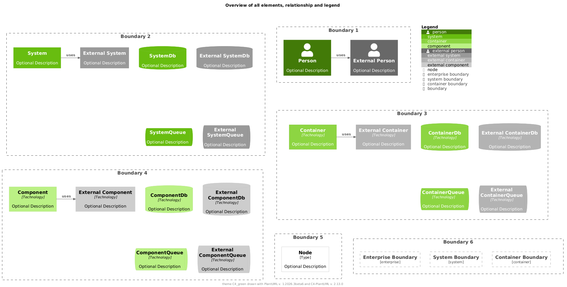 @startuml !theme C4_green from https://raw.githubusercontent.com/plantuml-stdlib/C4-PlantUML/v2.13.0/themes !include https://raw.githubusercontent.com/plantuml-stdlib/C4-PlantUML/v2.13.0/percy/TestAllElementsWithLegend.puml @enduml