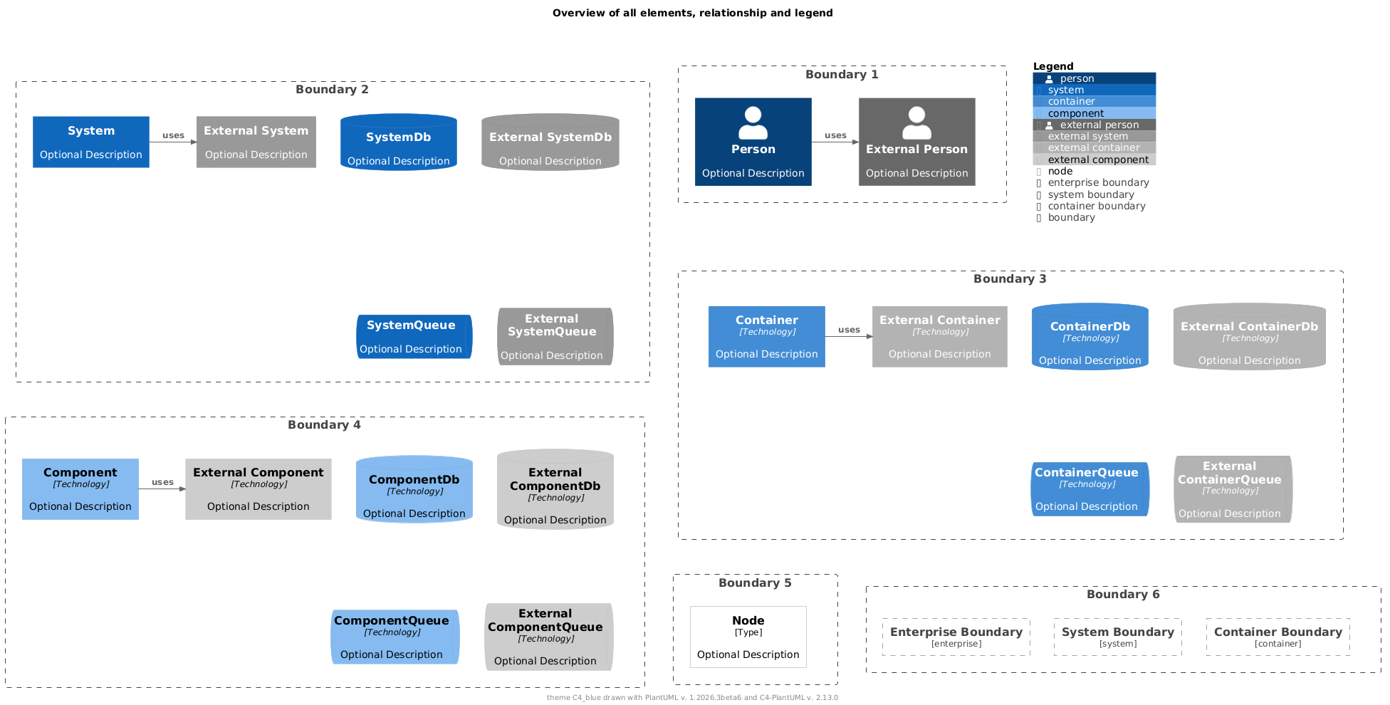 @startuml !theme C4_blue from https://raw.githubusercontent.com/plantuml-stdlib/C4-PlantUML/v2.13.0/themes !include https://raw.githubusercontent.com/plantuml-stdlib/C4-PlantUML/v2.13.0/percy/TestAllElementsWithLegend.puml @enduml