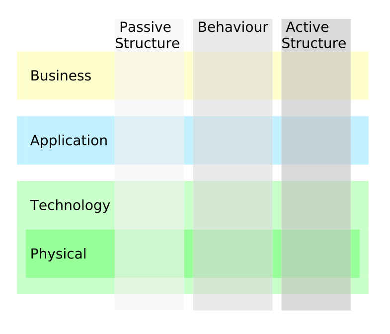 @startuml scale 2 rectangle table #transparent;line:transparent [ <#transparent,#transparent>| | |<#F8F8F8> Passive\nStructure | |<#E8E8E8> Behaviour | |<#D8D8D8> Active\nStructure | | |<#FFFFCC>|<#FFFFCC>\n Business \n | <#F7F7E3> |<#FFFFCC>| <#E8E8D4> |<#FFFFCC>| <#D9D9C5> |<#FFFFCC>|<#FFFFCC>| | | |<#F8F8F8>| |<#E8E8E8>| |<#D8D8D8>| | |<#C2F0FF>|<#C2F0FF>\n Application \n | <#DFF1F7> |<#C2F0FF>| <#D0E2E8> |<#C2F0FF>|<#C1D3D9> |<#C2F0FF>|<#C2F0FF>| | | |<#F8F8F8>| |<#E8E8E8>| |<#D8D8D8>| | |<#C9FFC9>|<#C9FFC9>\n Technology \n | <#E1F7E1> |<#C9FFC9>| <#D2E8D2> |<#C9FFC9>| <#C3D9C3> |<#C9FFC9>|<#C9FFC9>| |<#C9FFC9> |<#97FF97>\n Physical \n | <#CDF7CD> |<#97FF97> | <#BDE6BD> |<#97FF97> | <#AFD9AF> |<#97FF97> |<#C9FFC9> | |<#C9FFC9>|<#C9FFC9> | <#E1F7E1> |<#C9FFC9>| <#D2E8D2> |<#C9FFC9>| <#C3D9C3> |<#C9FFC9>|<#C9FFC9>| | | |<#F8F8F8>| |<#E8E8E8>| |<#D8D8D8>| | ] @enduml