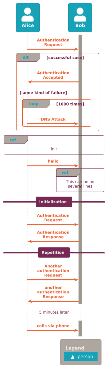 @startuml !theme C4_united from https://raw.githubusercontent.com/plantuml-stdlib/C4-PlantUML/master/themes !include https://raw.githubusercontent.com/plantuml-stdlib/C4-PlantUML/master/C4_Sequence.puml Person(Alice, "Alice") Person(Bob, "Bob") activate Bob Rel(Alice, Bob, "Authentication Request") alt successful case Rel(Bob, Alice, "Authentication Accepted") else some kind of failure loop 1000 times Rel(Alice, Bob, "DNS Attack") end end ref over Alice, Bob : init Rel(Alice, Bob, "hello") ref over Bob This can be on several lines end ref == Initialization == Rel(Alice, Bob, "Authentication Request") Rel(Bob, Alice, "Authentication Response") == Repetition == Rel(Alice, Bob, "Another authentication Request") Rel(Bob, Alice, "another authentication Response") ... 5 minutes later ... Rel(Alice, Bob, "calls via phone") SHOW_LEGEND() @enduml
