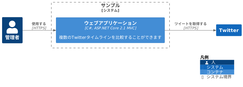 @startuml !theme C4Language_japanese from https://raw.githubusercontent.com/plantuml-stdlib/C4-PlantUML/master/themes !include https://raw.githubusercontent.com/plantuml-stdlib/C4-PlantUML/master/C4_Container.puml LAYOUT_LANDSCAPE() Person(admin, "管理者") System_Boundary(c1, 'サンプル') { Container(web_app, "ウェブアプリケーション", "C#, ASP.NET Core 2.1 MVC", "複数のTwitterタイムラインを比較することができます") } System(twitter, "Twitter") Rel(admin, web_app, "使用する", "HTTPS") Rel(web_app, twitter, "ツイートを取得する", "HTTPS") SHOW_LEGEND() @enduml