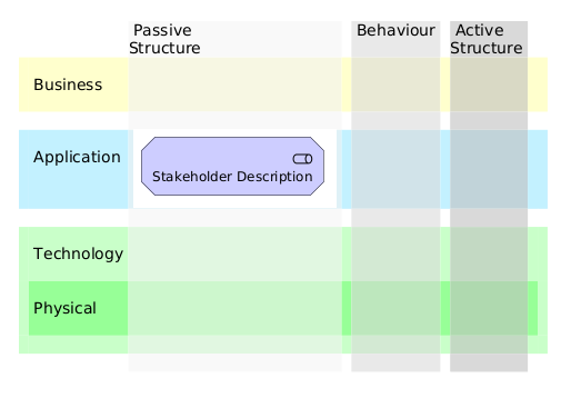 @startuml rectangle table #transparent;line:transparent [ <#transparent,#transparent>| | |<#F8F8F8> Passive\nStructure | |<#E8E8E8> Behaviour | |<#D8D8D8> Active\nStructure | | |<#FFFFCC>|<#FFFFCC>\n Business \n | <#F7F7E3> |<#FFFFCC>| <#E8E8D4> |<#FFFFCC>| <#D9D9C5> |<#FFFFCC>|<#FFFFCC>| | | |<#F8F8F8>| |<#E8E8E8>| |<#D8D8D8>| | |<#C2F0FF>|<#C2F0FF>\n Application \n | <#DFF1F7> <img:https://www.plantuml.com/plantuml/png/JSv12W8n30NGVKzHPwKWU06H4NJfoWD8R8CJcYP3cdf-nyN0x1x_y-6FpS6yLmwjaCnWKECRKlcOTib9MIswWRIbGl6m8qdSCyOpM9geWkFfkkeI7khq1IULrzEXuAISqVORtnahYX_Zi0dZ3Liocl_3uH16bBnS-W40> |<#C2F0FF>| <#D0E2E8> |<#C2F0FF>|<#C1D3D9> |<#C2F0FF>|<#C2F0FF>| | | |<#F8F8F8>| |<#E8E8E8>| |<#D8D8D8>| | |<#C9FFC9>|<#C9FFC9>\n Technology \n | <#E1F7E1> |<#C9FFC9>| <#D2E8D2> |<#C9FFC9>| <#C3D9C3> |<#C9FFC9>|<#C9FFC9>| |<#C9FFC9> |<#97FF97>\n Physical \n | <#CDF7CD> |<#97FF97> | <#BDE6BD> |<#97FF97> | <#AFD9AF> |<#97FF97> |<#C9FFC9> | |<#C9FFC9>|<#C9FFC9> | <#E1F7E1> |<#C9FFC9>| <#D2E8D2> |<#C9FFC9>| <#C3D9C3> |<#C9FFC9>|<#C9FFC9>| | | |<#F8F8F8>| |<#E8E8E8>| |<#D8D8D8>| | ] @enduml