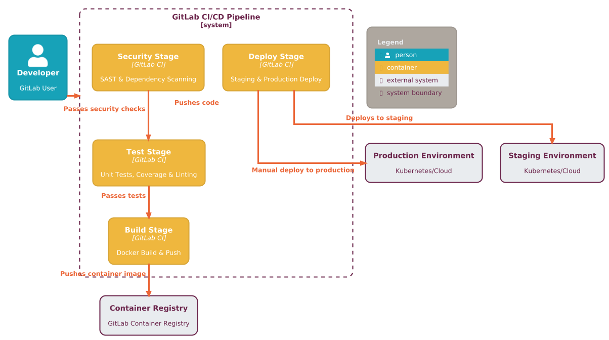 @startuml !theme C4_united from https://raw.githubusercontent.com/plantuml-stdlib/C4-PlantUML/master/themes !include https://raw.githubusercontent.com/plantuml-stdlib/C4-PlantUML/master/C4_Container.puml 'LAYOUT_WITH_LEGEND() skinparam { linetype ortho ArrowThickness 3 roundcorner 20 maxMessageSize 300 wrapWidth 300 } Person(developer, "Developer", "GitLab User") System_Boundary(pipeline, "GitLab CI/CD Pipeline") { Container(security, "Security Stage", "GitLab CI", "SAST & Dependency Scanning") Container(test, "Test Stage", "GitLab CI", "Unit Tests, Coverage & Linting") Container(build, "Build Stage", "GitLab CI", "Docker Build & Push") Container(deploy, "Deploy Stage", "GitLab CI", "Staging & Production Deploy") } System_Ext(registry, "Container Registry", "GitLab Container Registry") System_Ext(production, "Production Environment", "Kubernetes/Cloud") System_Ext(staging, "Staging Environment", "Kubernetes/Cloud") Rel_Right(developer, pipeline, "Pushes code") Rel(security, test, "Passes security checks") Rel(test, build, "Passes tests") Rel(build, registry, "Pushes container image") Rel(deploy, staging, "Deploys to staging") Rel(deploy, production, "Manual deploy to production") SHOW_FLOATING_LEGEND() @enduml