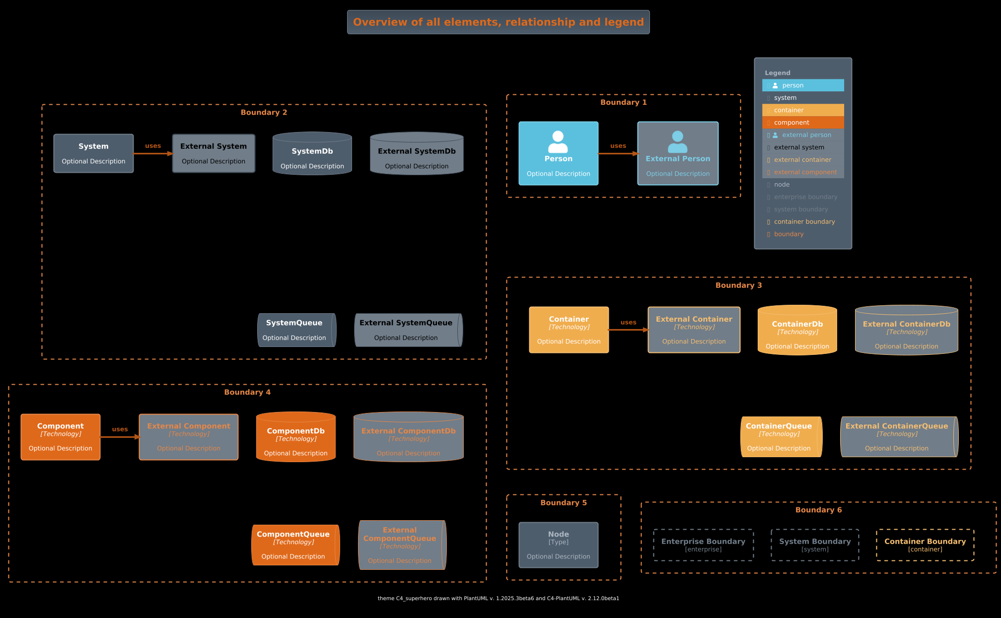 @startuml !theme C4_superhero from https://raw.githubusercontent.com/plantuml-stdlib/C4-PlantUML/master/themes !include https://raw.githubusercontent.com/plantuml-stdlib/C4-PlantUML/master/percy/TestAllElementsWithLegend.puml @enduml