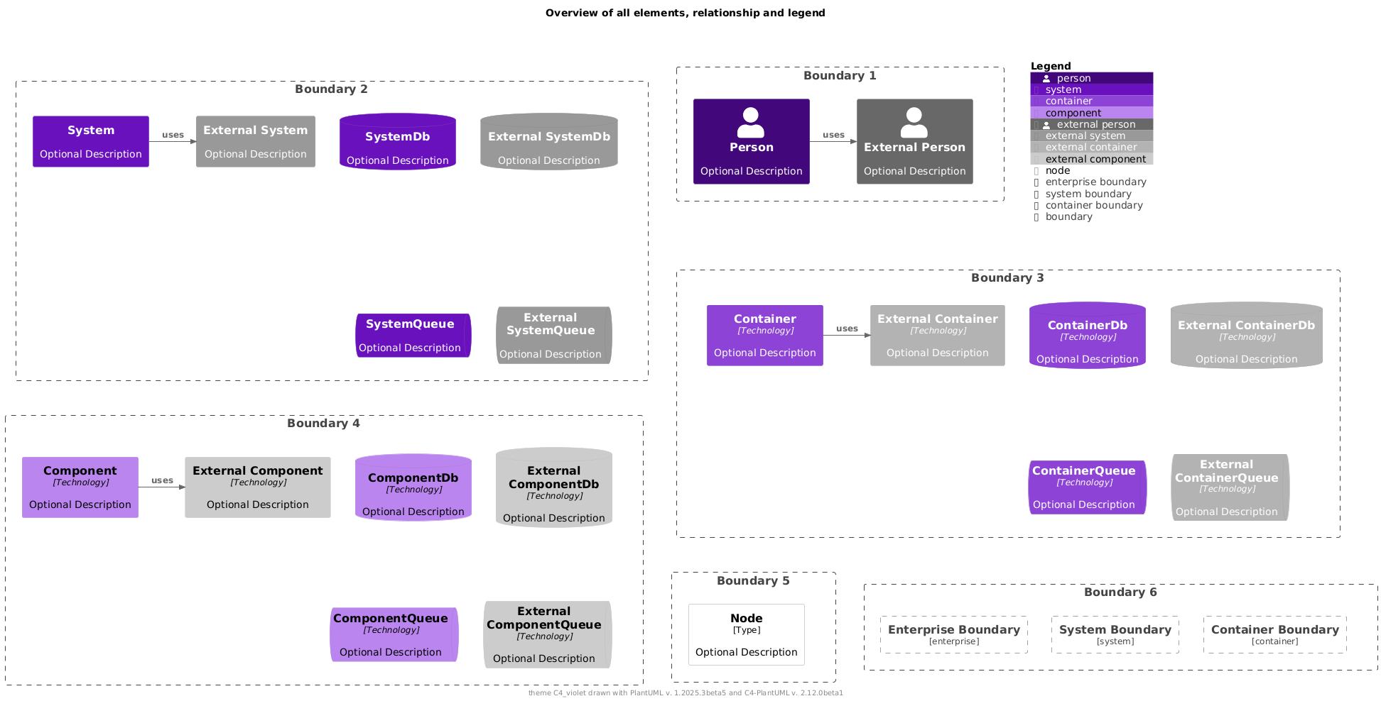 @startuml !theme C4_violet from https://raw.githubusercontent.com/plantuml-stdlib/C4-PlantUML/master/themes !include https://raw.githubusercontent.com/plantuml-stdlib/C4-PlantUML/master/percy/TestAllElementsWithLegend.puml @enduml