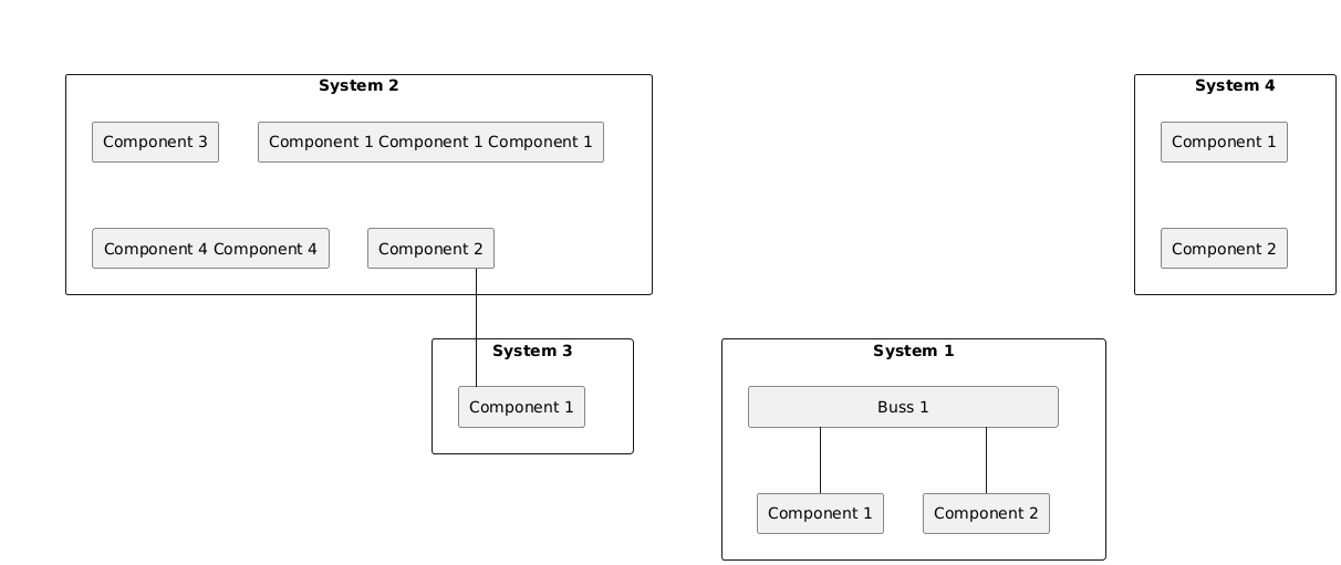 @startuml skinparam { linetype ortho componentStyle rectangle } hide <<layout>> stereotype hide <<layout>> rectangle "0" as grid_0_0 <<layout>> rectangle "1" as grid_1_0 <<layout>> rectangle "1" as grid_0_1 <<layout>> rectangle "2" as grid_0_2 <<layout>> rectangle "3" as grid_0_3 <<layout>> rectangle "4" as grid_0_4 <<layout>> rectangle "\ \ \ \ 3" as grid_3_1 <<layout>> rectangle "\ \ \ 2" as grid_2_3 <<layout>> rectangle "4" as grid_4_3 <<layout>> grid_0_0 -right- grid_1_0 grid_0_0 -down- grid_0_1 grid_0_1 -down- grid_0_2 grid_0_2 -down- grid_0_3 grid_0_3 -down- grid_0_4 grid_0_3 -right- grid_2_3 rectangle "System 1" as system_1 { component " Buss 1 " as system_1_buss_1 component "Component 1" as system_1_component_1 component "Component 2" as system_1_component_2 system_1_buss_1 -down- system_1_component_1 system_1_buss_1 -down- system_1_component_2 'this breaks 'system_1_component_1 -right[hidden]-system_1_component_2 } rectangle "System 2" as system_2 { component [Component 1 Component 1 Component 1] as system_2_component_1 component [Component 2] as system_2_component_2 component [Component 3] as system_2_component_3 component [Component 4 Component 4] as system_2_component_4 system_2_component_1 -down[hidden]- system_2_component_2 system_2_component_1 -left[hidden]- system_2_component_3 system_2_component_3 -down[hidden]- system_2_component_4 } rectangle "System 3" as system_3 { component [Component 1] as system_3_component_1 } rectangle "System 4" as system_4 { component [Component 1] as system_4_component_1 component [Component 2] as system_4_component_2 system_4_component_1 -down[hidden]- system_4_component_2 } grid_0_1 -right- system_2 system_2 -right- grid_3_1 grid_3_1 -right- system_4 grid_2_3 -right- system_3 system_3 --right-- grid_4_3 grid_4_3 --right-- system_1 system_3_component_1 -[norank]- system_2_component_2 'breaks 'system_1_component_2 -left[norank]- system_4_component_1 'system_1_component_1 -left[norank]- system_2_component_2 @enduml