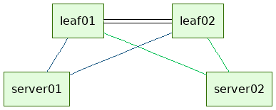 @startuml digraph g { label="" labelloc=t forcelabels=true graph [fontname="Helvetica"] graph [style=wedged] node [label="" shape=box fontname="Helvetica-Bold" fontsize="12pt" style=filled fillcolor="#E3FCDD:#BFF4AC" color="#336F05" gradientangle=90] edge [fontname="Helvetica" fontsize="10pt"] sx01 [label="leaf01"] sx02 [label="leaf02"] S1 [label="server01"] S2 [label="server02"] concentrate=true { rank = same; sx01 sx02 } { rank = same; S1 S2 } sx01 -> sx02 [minlen=4 peripheries=2 color="black:white:black" arrowhead=none labeldistance=4 labelangle=0 headlabel=< <table border="0"> <tr><td></td></tr> <tr><td></td></tr> <tr><td></td></tr> <tr><td></td></tr> </table> > ] sx01 -> S1 [color="#1A5883" arrowhead=none labelangle=75 taillabel="" headlabel="" fontsize="8pt"] sx01 -> S2 [color="#00BE50" arrowhead=none labelangle=35 taillabel="" headlabel="" fontsize="8pt"] sx02 -> S1 [color="#1A5883" arrowhead=none labelangle=35 taillabel="" headlabel="" fontsize="8pt"] sx02 -> S2 [color="#00BE50" arrowhead=none labelangle=-75 taillabel="" headlabel="" fontsize="8pt"] S1 -> S2 [minlen=8 style=invis arrowhead=none] } @enduml