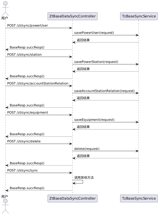 @startuml actor 用户 participant "ZtBaseDataSyncController" as controller participant "TzBaseSyncService" as service 用户 -> controller : POST /zt/sync/powerUser controller -> service : savePowerUser(request) service --> controller : 返回结果 controller --> 用户 : BaseResp.succResp() 用户 -> controller : POST /zt/sync/station controller -> service : savePowerStation(request) service --> controller : 返回结果 controller --> 用户 : BaseResp.succResp() 用户 -> controller : POST /zt/sync/accountStationRelation controller -> service : saveAccountStationRelation(request) service --> controller : 返回结果 controller --> 用户 : BaseResp.succResp() 用户 -> controller : POST /zt/sync/equipment controller -> service : saveEquipment(request) service --> controller : 返回结果 controller --> 用户 : BaseResp.succResp() 用户 -> controller : POST /zt/sync/delete controller -> service : delete(request) service --> controller : 返回结果 controller --> 用户 : BaseResp.succResp() 用户 -> controller : POST /zt/sync/sync controller -> controller : 调用其他方法 controller --> 用户 : BaseResp.succResp() @enduml