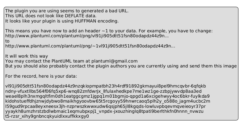 @startuml legend The plugin you are using seems to generated a bad URL. This URL does not look like DEFLATE data. It looks like your plugin is using HUFFMAN encoding. This means you have now to add an header ~1 to your data. For example, you have to change: http://www.plantuml.com/plantuml/png/vl91ji905dtt51fsn80odapdz44z9n... to http://www.plantuml.com/plantuml/png/~1vl91ji905dtt51fsn80odapdz44z9n... It will work this way You may contact the PlantUML team at plantuml@gmail.com But you should also probably contact the plugin authors you are currently using and send them this image For the record, here is your data: vl91ji905dtt51fsn80odapdz44z9nzqkiopmpatbh23h4rdf91892gkmayui8pel9hmcqvbr-6qfqkb ndny-vfuxtllbs564f06fq5xp6-wnq82znfdwrjx_llfulaxhedkpe7me1wz1ge-zzbpjywvdp8aa3ed weael8plh3nxmgqltfim0dh1eatggcgmz1jgpq1m01bgmjo-qpgd1a6xcigehwyy4oc6bkr-fuylkda9 kidohstueffdhjznwjdybwo8maikhgyoovbw65t5rcgoyy59hnwrcaoq5plh2y_o588o_jagm4ucbc2m l59gud9rpcaa8eyxneesx3jh-nzprwszkwwxudw6qsjph65jl8kgqds-lowluvpbqevmqveieoyr37pr yyaykh8umzhrstzbdlwbmaic1eqmubpxpj1_vnpdx-jxouzhinglq8tpati9berlthkfn0hnnn_nvwzu t5-rzsr_xihy9gnbncqkyuidlxxuffkkxgy0 endlegend @enduml