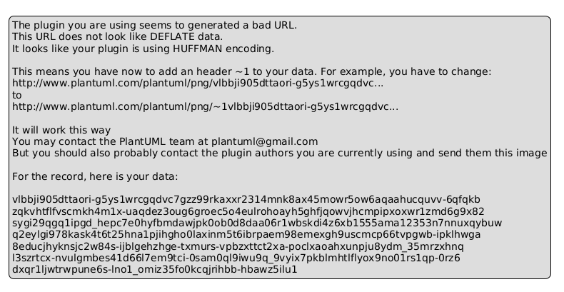 @startuml legend The plugin you are using seems to generated a bad URL. This URL does not look like DEFLATE data. It looks like your plugin is using HUFFMAN encoding. This means you have now to add an header ~1 to your data. For example, you have to change: http://www.plantuml.com/plantuml/png/vlbbji905dttaori-g5ys1wrcgqdvc... to http://www.plantuml.com/plantuml/png/~1vlbbji905dttaori-g5ys1wrcgqdvc... It will work this way You may contact the PlantUML team at plantuml@gmail.com But you should also probably contact the plugin authors you are currently using and send them this image For the record, here is your data: vlbbji905dttaori-g5ys1wrcgqdvc7gzz99rkaxxr2314mnk8ax45mowr5ow6aqaahucquvv-6qfqkb zqkvhtflfvscmkh4m1x-uaqdez3oug6groec5o4eulrohoayh5ghfjqowvjhcmpipxoxwr1zmd6g9x82 sygi29qgq1ipgd_hepc7e0hyfbmdawjpk0ob0d8daa06r1wbskdi4z6xb1555ama12353n7nnuxqybuw q2eylgi978kask4t6t25hna1pjihgho0laxinm5t6ibrpaem98emexgh9uscmcp66tvpgwb-ipklhwga 8educjhyknsjc2w84s-ijblgehzhge-txmurs-vpbzxttct2xa-poclxaoahxunpju8ydm_35mrzxhnq l3szrtcx-nvulgmbes41d66l7em9tci-0sam0ql9iwu9q_9vyix7pkblmhtlflyox9no01rs1qp-0rz6 dxqr1ljwtrwpune6s-lno1_omiz35fo0kcqjrihbb-hbawz5ilu1 endlegend @enduml