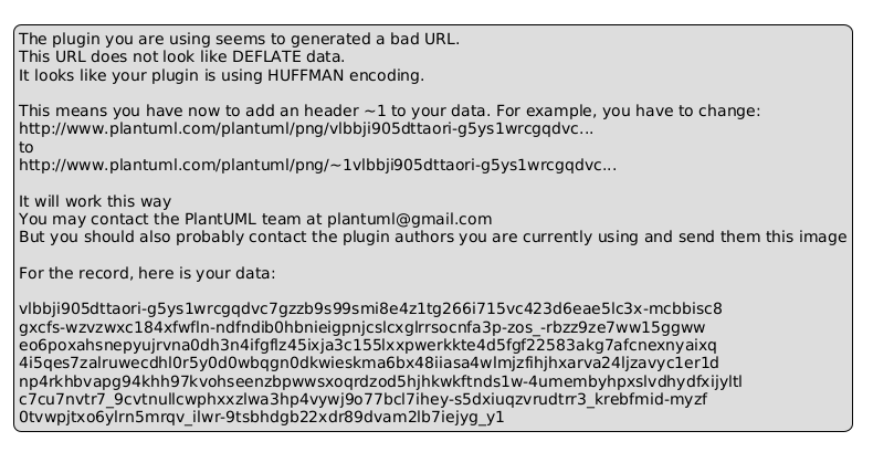 @startuml legend The plugin you are using seems to generated a bad URL. This URL does not look like DEFLATE data. It looks like your plugin is using HUFFMAN encoding. This means you have now to add an header ~1 to your data. For example, you have to change: http://www.plantuml.com/plantuml/png/vlbbji905dttaori-g5ys1wrcgqdvc... to http://www.plantuml.com/plantuml/png/~1vlbbji905dttaori-g5ys1wrcgqdvc... It will work this way You may contact the PlantUML team at plantuml@gmail.com But you should also probably contact the plugin authors you are currently using and send them this image For the record, here is your data: vlbbji905dttaori-g5ys1wrcgqdvc7gzzb9s99smi8e4z1tg266i715vc423d6eae5lc3x-mcbbisc8 gxcfs-wzvzwxc184xfwfln-ndfndib0hbnieigpnjcslcxglrrsocnfa3p-zos_-rbzz9ze7ww15ggww eo6poxahsnepyujrvna0dh3n4ifgflz45ixja3c155lxxpwerkkte4d5fgf22583akg7afcnexnyaixq 4i5qes7zalruwecdhl0r5y0d0wbqgn0dkwieskma6bx48iiasa4wlmjzfihjhxarva24ljzavyc1er1d np4rkhbvapg94khh97kvohseenzbpwwsxoqrdzod5hjhkwkftnds1w-4umembyhpxslvdhydfxijyltl c7cu7nvtr7_9cvtnullcwphxxzlwa3hp4vywj9o77bcl7ihey-s5dxiuqzvrudtrr3_krebfmid-myzf 0tvwpjtxo6ylrn5mrqv_ilwr-9tsbhdgb22xdr89dvam2lb7iejyg_y1 endlegend @enduml