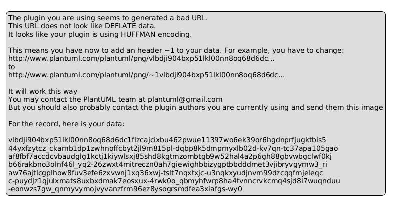 @startuml legend The plugin you are using seems to generated a bad URL. This URL does not look like DEFLATE data. It looks like your plugin is using HUFFMAN encoding. This means you have now to add an header ~1 to your data. For example, you have to change: http://www.plantuml.com/plantuml/png/vlbdji904bxp51lkl00nn8oq68d6dc... to http://www.plantuml.com/plantuml/png/~1vlbdji904bxp51lkl00nn8oq68d6dc... It will work this way You may contact the PlantUML team at plantuml@gmail.com But you should also probably contact the plugin authors you are currently using and send them this image For the record, here is your data: vlbdji904bxp51lkl00nn8oq68d6dc1flzcajcixbu462pwue11397wo6ek39or6hgdnprfjugktbis5 44yxfzytcz_ckamb1dp1zwhnoffcbyt2jl9m815pl-dqbp8k5dmpmyxlb02d-kv7qn-tc37apa105gao af8fbf7accdcvbaudglg1kctj1kiywlsxj85shd8kgtmzombtgb9w52hal4a2p6gh88gbvwbgclwf0kj b66rakbno3olnf46l_yq2-26zwxt4mitreczn0ah7giewighbbizygptbbdddmet3vjibryvgymw3_ri aw76ajtlcgplhow8fuv3efe6zxvwnj1xq36xwj-tslt7nqxtxjc-u3nqkxyudjnvm99dzcqqfmjeleqc c-puydjz1qjulxmats8uxbxdmak7eosxux-4rwk0o_qbmyhfwrp8ha4tvnncrvkcmq4sjd8i7wuqnduu -eonwzs7gw_qnmyvymojvyvanzfrm96ez8ysogrsmdfea3xiafgs-wy0 endlegend @enduml