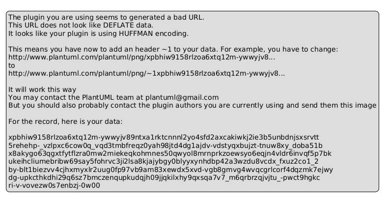 @startuml legend The plugin you are using seems to generated a bad URL. This URL does not look like DEFLATE data. It looks like your plugin is using HUFFMAN encoding. This means you have now to add an header ~1 to your data. For example, you have to change: http://www.plantuml.com/plantuml/png/xpbhiw9158rlzoa6xtq12m-ywwyjv8... to http://www.plantuml.com/plantuml/png/~1xpbhiw9158rlzoa6xtq12m-ywwyjv8... It will work this way You may contact the PlantUML team at plantuml@gmail.com But you should also probably contact the plugin authors you are currently using and send them this image For the record, here is your data: xpbhiw9158rlzoa6xtq12m-ywwyjv89ntxa1rktcnnnl2yo4sfd2axcakiwkj2ie3b5unbdnjsxsrvtt 5rehehp-_vzlpxc6cow0q_vqd3tmbfreqz0yah98jtd4dg1ajdv-vdstyqxbujzt-tnuw8xy_doba51b x8akygo63qgxtfytflzra0mw2miekeqkohmnes50qwyol8mrnprkzoewsyo6eqjn4vldr6invqf5p7bk ukeihcliumebribw69say5fohrvc3ji2lsa8kjajybgy0blyyxynhdbp42a3wzdu8vcdx_fxuz2co1_2 by-blt1biezvv4cjhxmyxlr2uug0fp97vb9am83xewdx5xvd-vgb8gmvg4wvqcgrlcorf4dqzmk7ejwy dg-upkcthkdhi29q6sz7bmczenqupkudqjh09jjqkilxhy9qxsqa7v7_m6qrbrzqjvjtu_-pwct9hgkc ri-v-vovezw0s7enbzj-0w00 endlegend @enduml