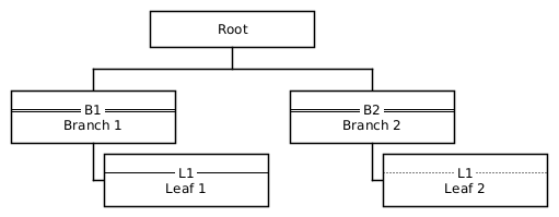 @startwbs <style> wbsDiagram { LineColor Black BackgroundColor White node { HorizontalAlignment center Margin 10 MinimumWidth 150 } } </style> + Root ++ == B1 ==\nBranch 1 +++ -- L1 --\nLeaf 1 ++ == B2 ==\nBranch 2 +++ .. L1 ..\nLeaf 2 @endwbs