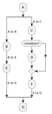 @startuml :A; split; -> A to B; :B; -> B to E; :E; -> E to G; split again; -> A to C; :C; if (condition?) then :D; endif :F; ->F to G; end split; :G; @enduml
