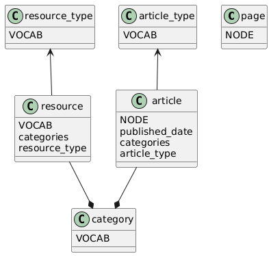 @startuml class page page : NODE class article article : NODE article : published_date article : categories article : article_type class resource resource : VOCAB resource : categories resource : resource_type class article_type article_type : VOCAB class resource_type resource_type : VOCAB class category category : VOCAB article --* category article -u-> article_type resource --* category resource -u-> resource_type @enduml