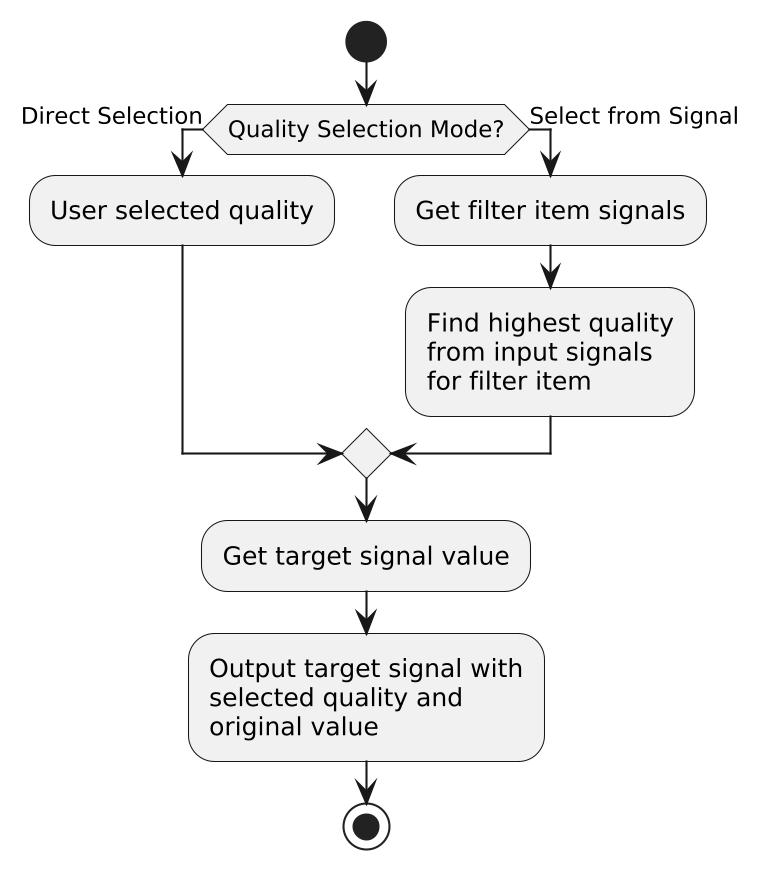 @startuml skinparam backgroundColor transparent skinparam dpi 200 start if (Quality Selection Mode?) then (Direct Selection) :User selected quality; else (Select from Signal) :Get filter item signals; :Find highest quality\nfrom input signals\nfor filter item; endif :Get target signal value; :Output target signal with\nselected quality and\noriginal value; stop @enduml