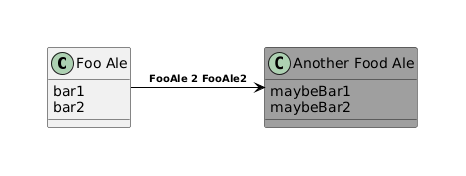 @startuml <style> document { Margin 40 40 40 40 } arrow { LineColor black FontColor black FontSize 10 FontStyle bold Arrowthickness 50 } </style> class "Foo Ale" as FooAle { bar1 bar2 } class "Another Food Ale" as FooAle2 #9f9f9f { maybeBar1 maybeBar2 } FooAle -> FooAle2 : FooAle 2 FooAle2 @enduml