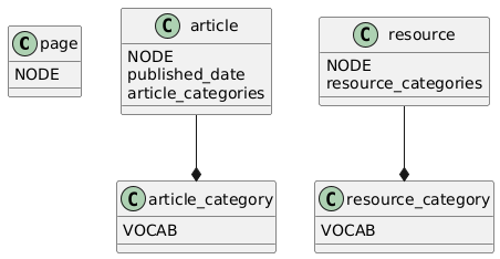 @startuml class page page : NODE class article article : NODE article : published_date article : article_categories class resource resource : NODE resource : resource_categories class article_category article_category : VOCAB class resource_category resource_category : VOCAB article --* article_category resource --* resource_category @enduml
