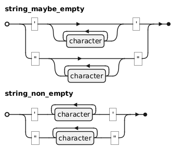 @startebnf string_maybe_empty = "'" , { character } , "'" | '"' , { character } , '"'; string_non_empty = "'" , { character }- , "'" | '"' , { character }- , '"'; @endebnf