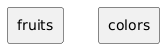 @startuml !$myjson = { "root" : [{ "fruits": [ { "name": "apple", "colorId": "1" }, { "name": "pear", "colorId": "2" }, { "name": "pineapple", "colorId": "3" } ] }, { "colors": [ { "id": "1", "name": "red" }, { "id": "2", "name": "green" }, { "id": "3", "name": "yellow" } ] }] } !foo = $myjson.root !foreach $key in %get_json_keys($myjson.root) rectangle $key !endfor @enduml