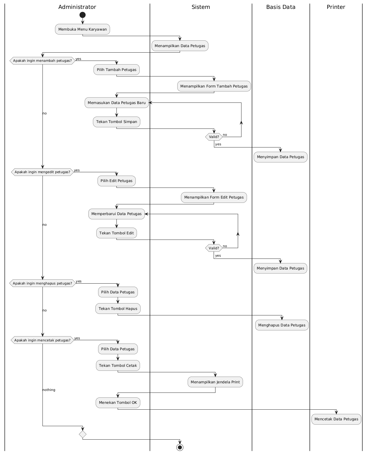 @startuml !pragma useVerticalIf on |Administrator| start :Membuka Menu Karyawan; |Sistem| :Menampilkan Data Petugas; |Administrator| if (Apakah ingin menambah petugas?) then (yes) :Pilih Tambah Petugas; |Sistem| :Menampilkan Form Tambah Petugas; |Administrator| repeat :Memasukan Data Petugas Baru; :Tekan Tombol Simpan; |Sistem| repeat while (Valid?) is (no) -> yes; |Basis Data| :Menyimpan Data Petugas; ' goto end process |Administrator| (no) elseif (Apakah ingin mengedit petugas?) then (yes) :Pilih Edit Petugas; |Sistem| :Menampilkan Form Edit Petugas; |Administrator| repeat :Memperbarui Data Petugas; :Tekan Tombol Edit; |Sistem| repeat while (Valid?) is (no) -> yes; |Basis Data| :Menyimpan Data Petugas; ' goto end process |Administrator| (no) elseif (Apakah ingin menghapus petugas?) then (yes) :Pilih Data Petugas; :Tekan Tombol Hapus; |Basis Data| :Menghapus Data Petugas; ' goto end process |Administrator| (no) elseif (Apakah ingin mencetak petugas?) then (yes) :Pilih Data Petugas; :Tekan Tombol Cetak; |Sistem| :Menampilkan Jendela Print; |Administrator| :Menekan Tombol OK; |Printer| :Mencetak Data Petugas; ' goto end process else (nothing) |Sistem| endif stop @enduml