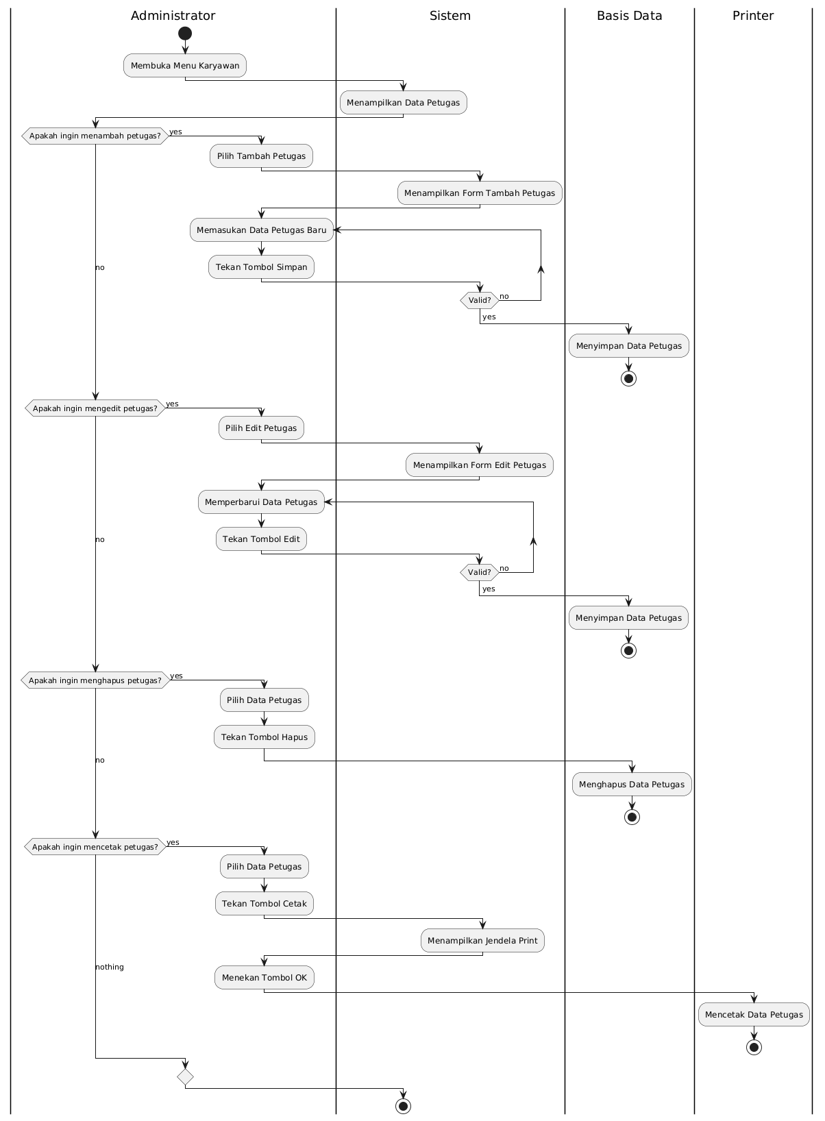 @startuml !pragma useVerticalIf on |Administrator| start :Membuka Menu Karyawan; |Sistem| :Menampilkan Data Petugas; |Administrator| if (Apakah ingin menambah petugas?) then (yes) :Pilih Tambah Petugas; |Sistem| :Menampilkan Form Tambah Petugas; |Administrator| repeat :Memasukan Data Petugas Baru; :Tekan Tombol Simpan; |Sistem| repeat while (Valid?) is (no) -> yes; |Basis Data| :Menyimpan Data Petugas; ' goto end process stop |Administrator| (no) elseif (Apakah ingin mengedit petugas?) then (yes) :Pilih Edit Petugas; |Sistem| :Menampilkan Form Edit Petugas; |Administrator| repeat :Memperbarui Data Petugas; :Tekan Tombol Edit; |Sistem| repeat while (Valid?) is (no) -> yes; |Basis Data| :Menyimpan Data Petugas; ' goto end process stop |Administrator| (no) elseif (Apakah ingin menghapus petugas?) then (yes) :Pilih Data Petugas; :Tekan Tombol Hapus; |Basis Data| :Menghapus Data Petugas; ' goto end process stop |Administrator| (no) elseif (Apakah ingin mencetak petugas?) then (yes) :Pilih Data Petugas; :Tekan Tombol Cetak; |Sistem| :Menampilkan Jendela Print; |Administrator| :Menekan Tombol OK; |Printer| :Mencetak Data Petugas; ' goto end process stop else (nothing) |Sistem| endif stop @enduml